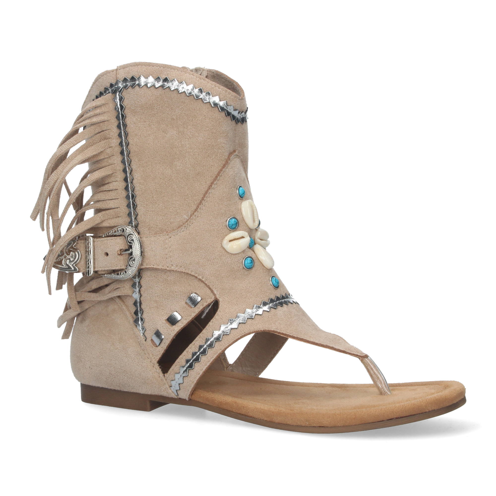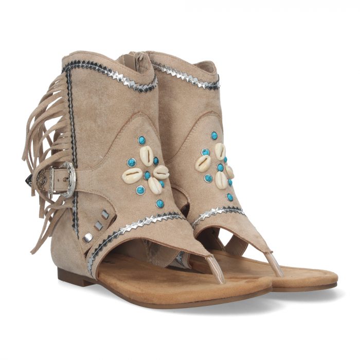 Sandalia Plana para Mujer Tipo Esclava con Flecos Detalles Met?licos Hebilla Ajustable y Adornos Cierre de Cremallera.
