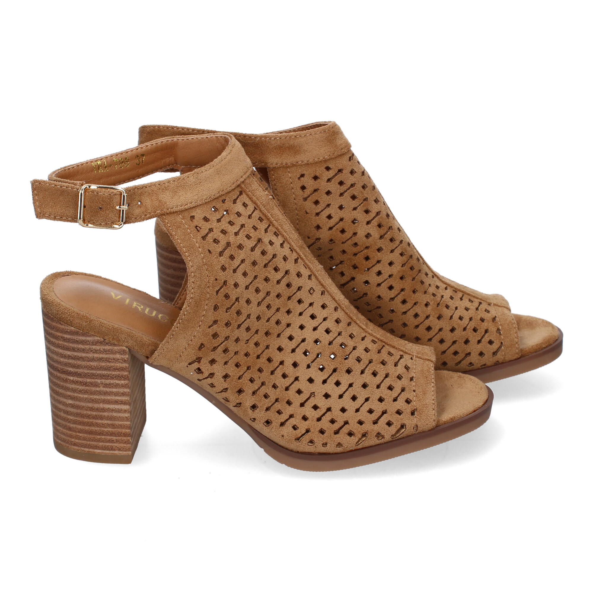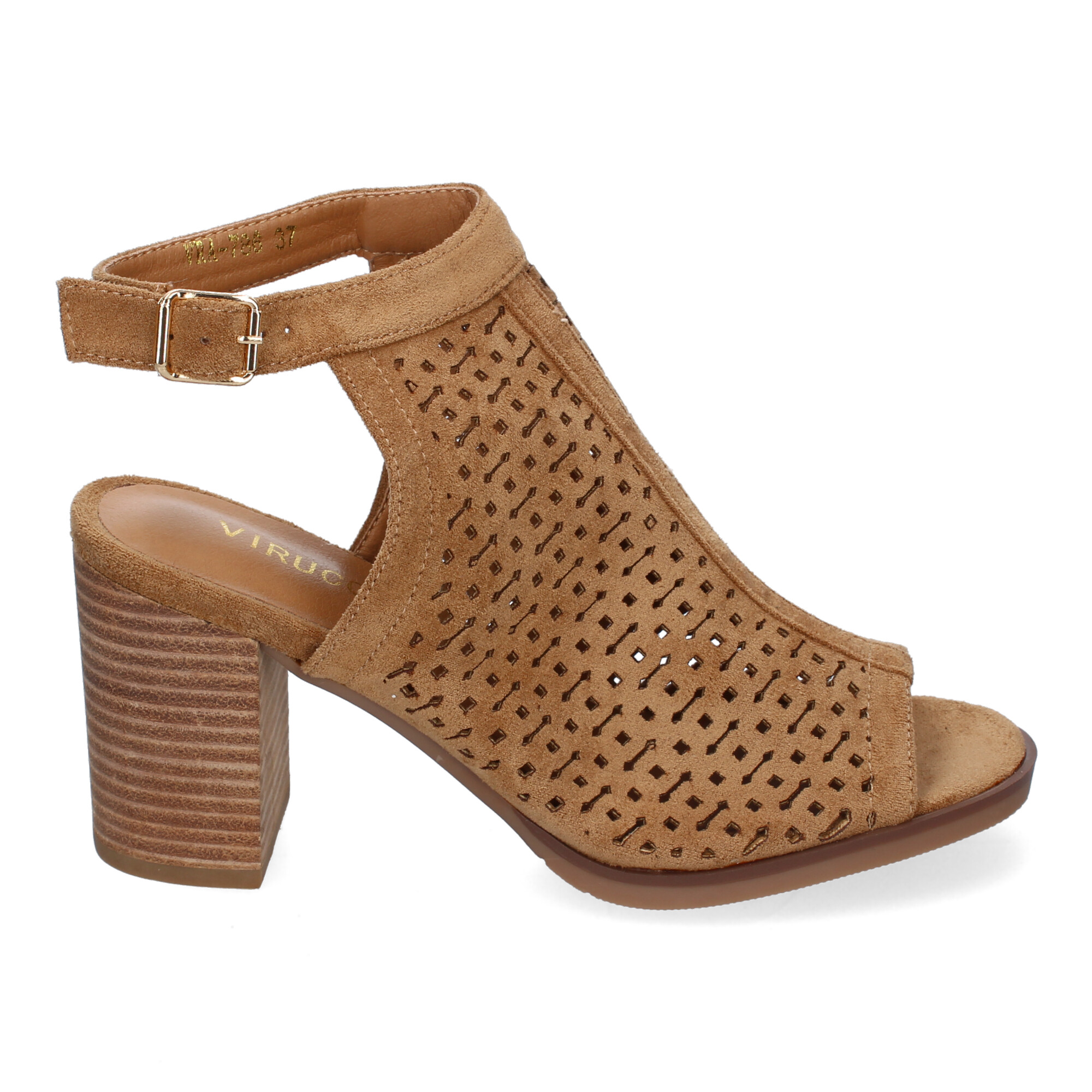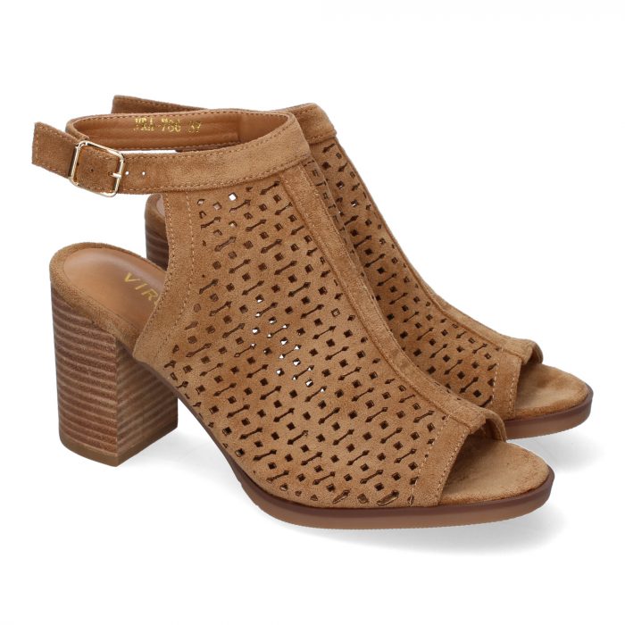 Sandalia de Tacon para Mujer con Calados y Detalles de Costura Punta y Talon Abiertos y Cierre de Hebilla Ideales para Primavera-Verano.