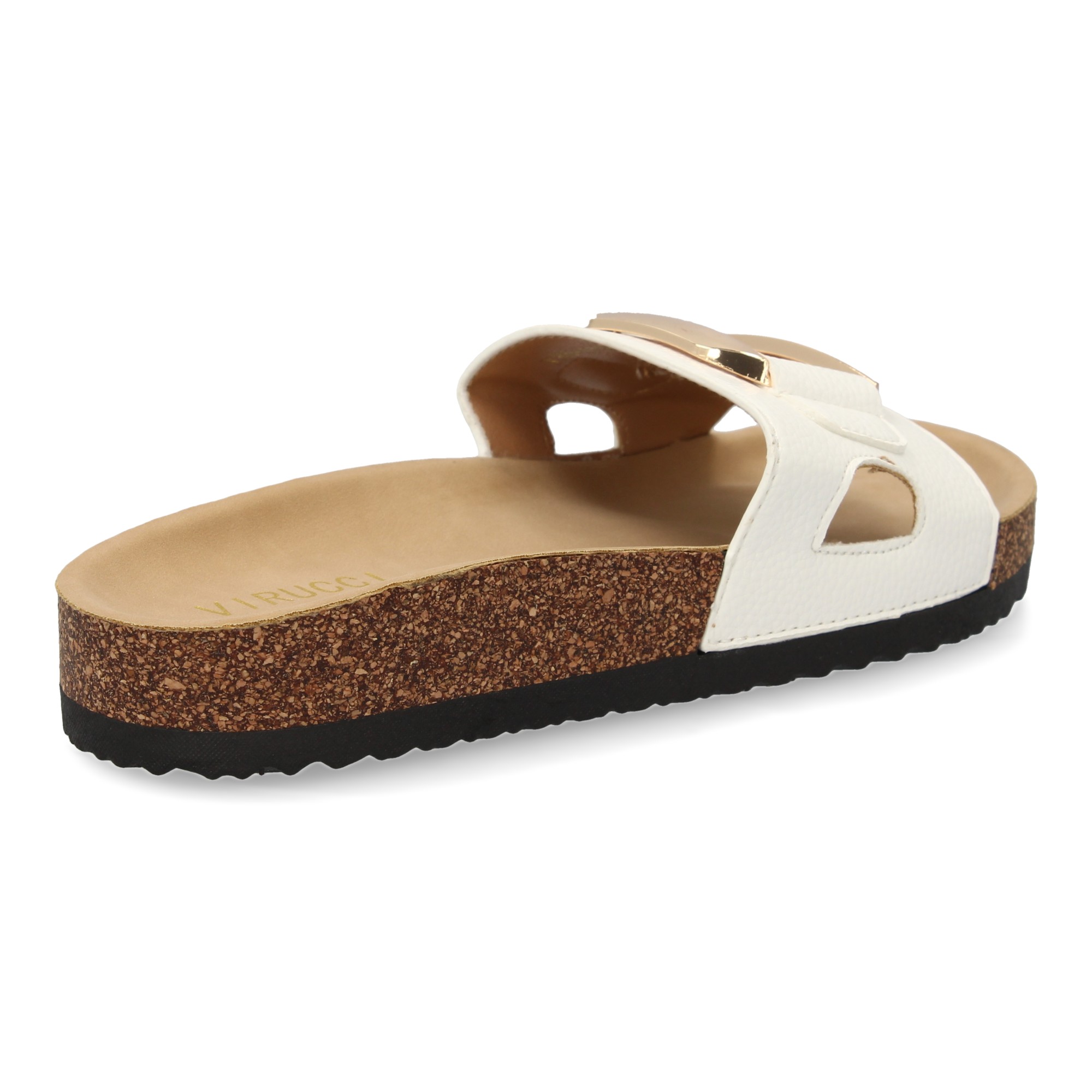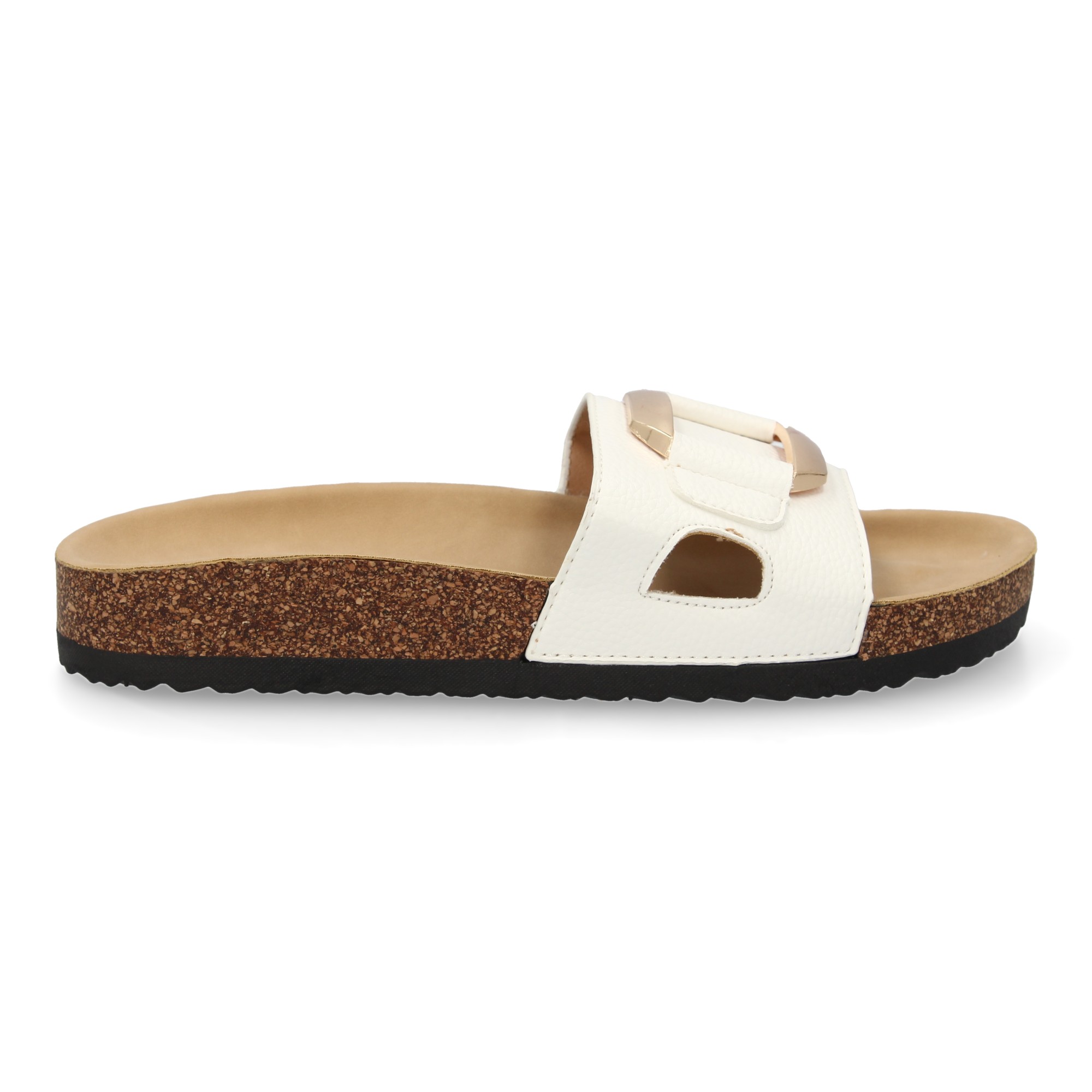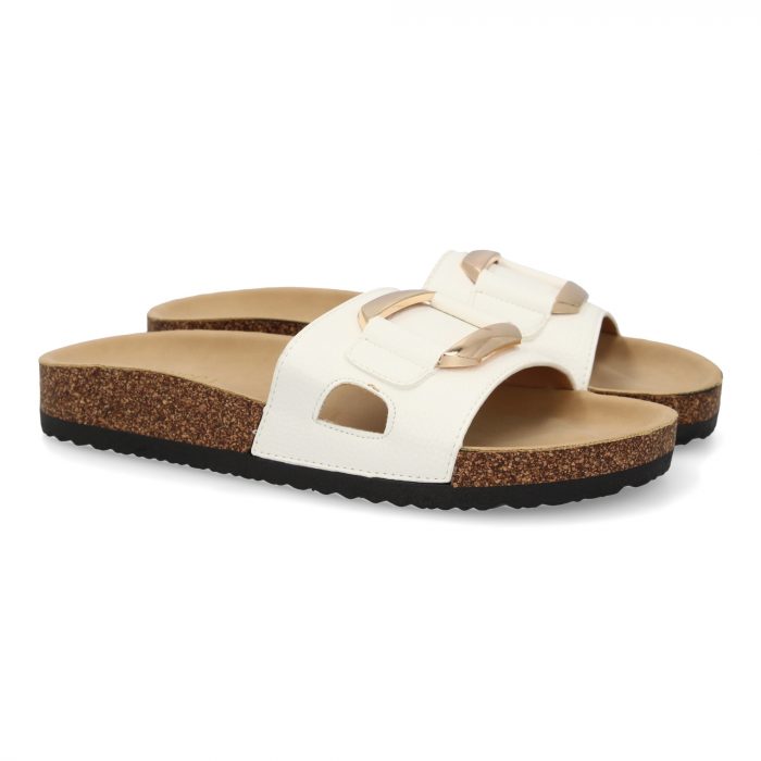 Sandalia plana de mujer comoda y elegante dise?o moderno con material bio detalle metalico en la pala ideales para primavera verano.