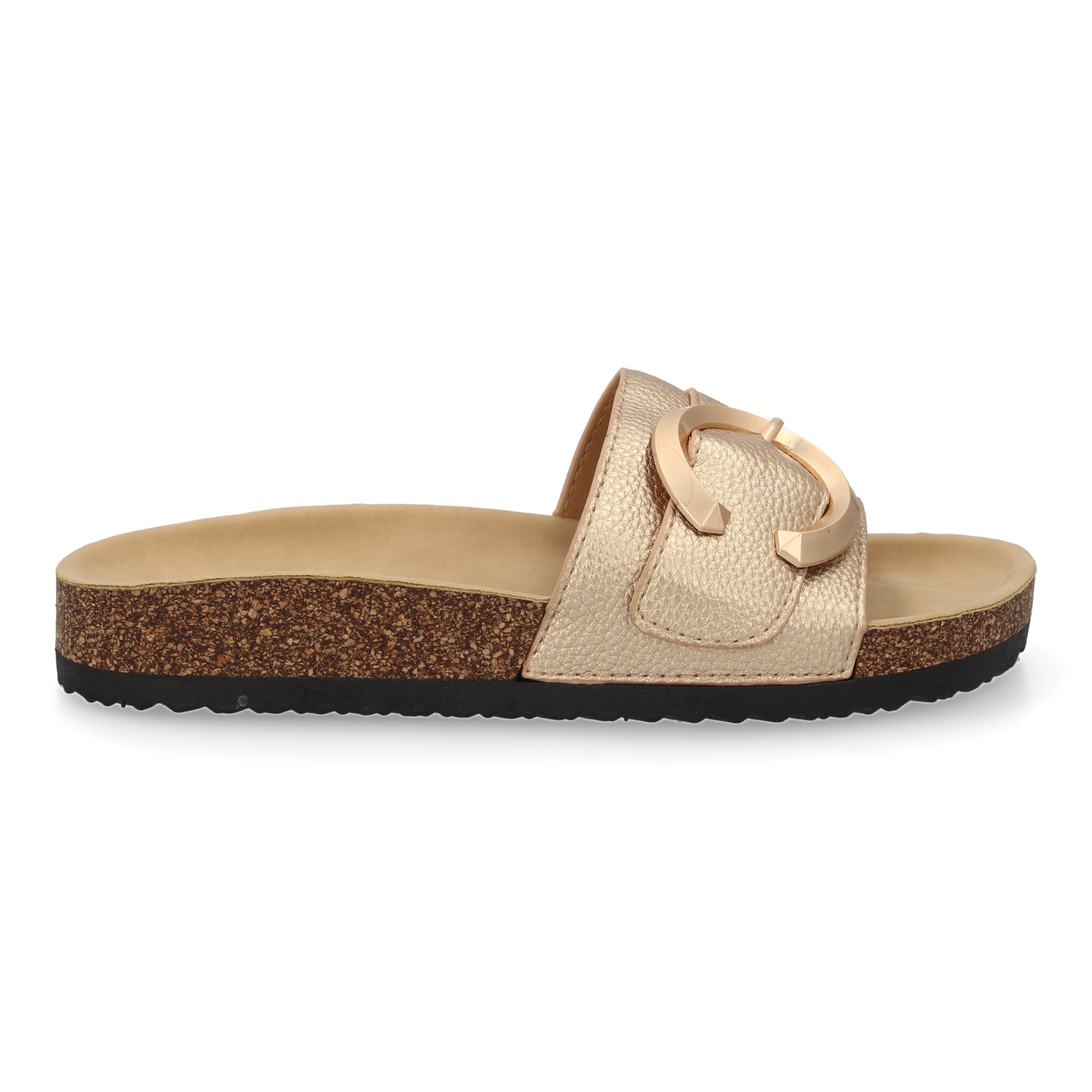 Sandalia plana de mujer comoda y elegante dise?o moderno con material bio detalle metalico en la pala ideales para primavera verano.
