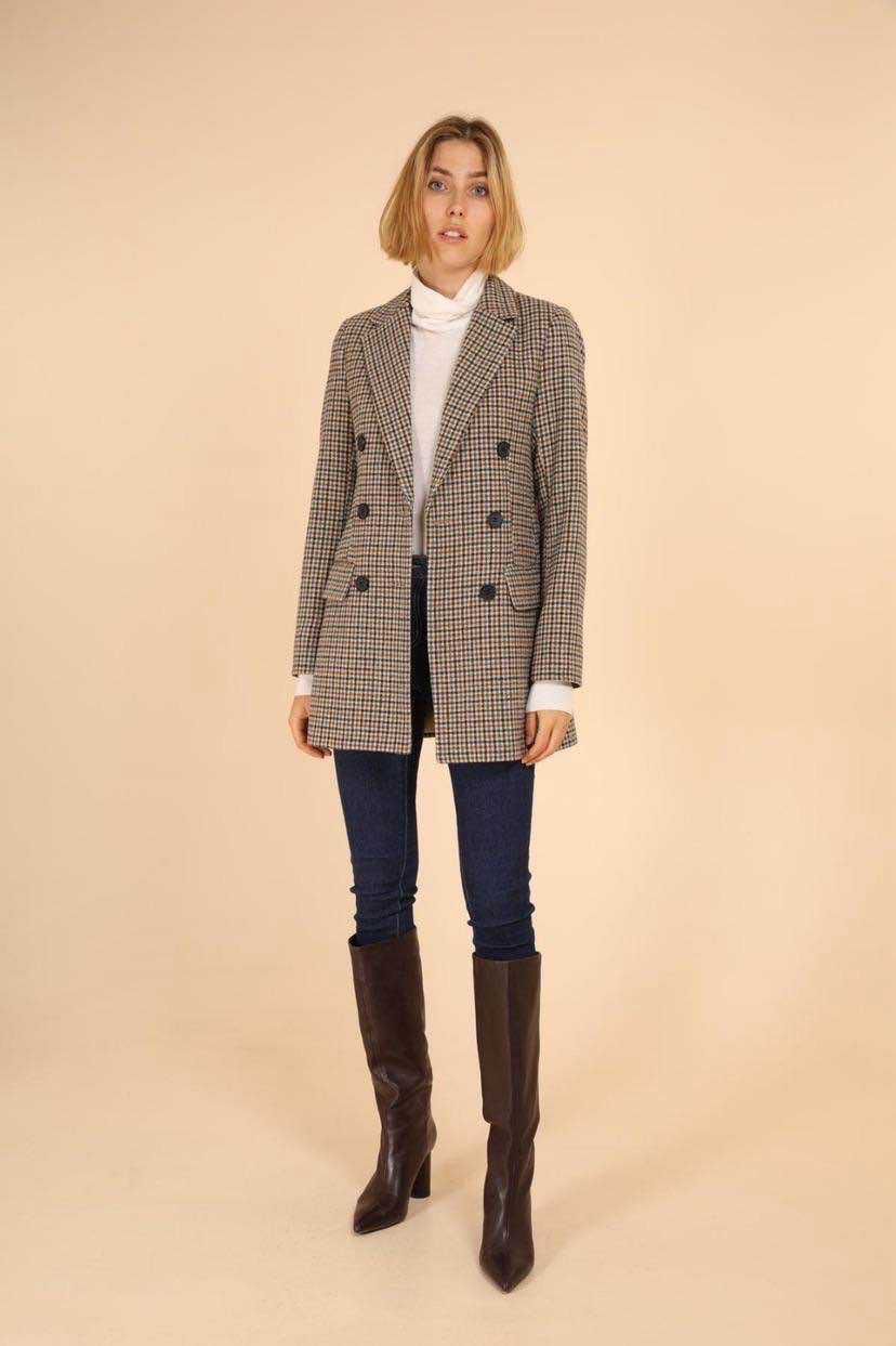 Confeccionado en un tejido firme pero ligeramente elástico (92 % poliéster y 8 % elastano), ofrece un ajuste cómodo y favorecedor. Su diseño cruzado con doble abotonadura frontal, solapa clásica y estampado de cuadros pequeños en tonos neutros lo convierten en un básico elegante y muy versátil.