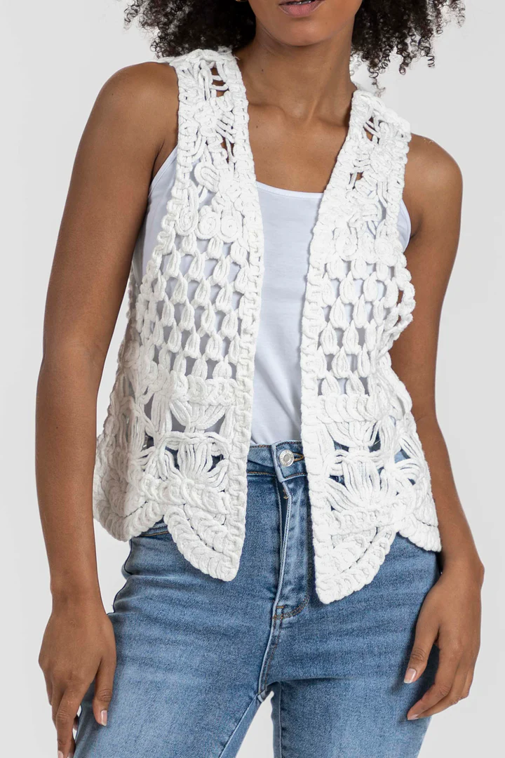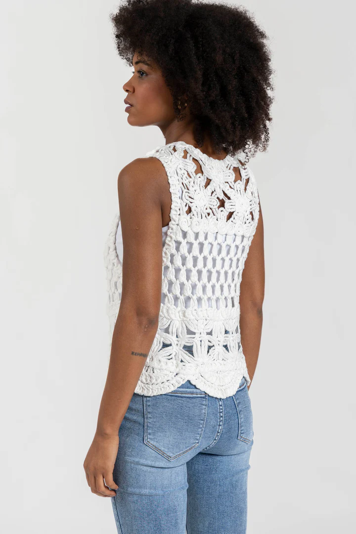 Tejido de algodón. Tejido de crochet. Diseño recto. Diseño calado. Manga sisa. Sin cierre. Bajo asimétrico. Talla S/M. Altura modelo: 1,66 m.