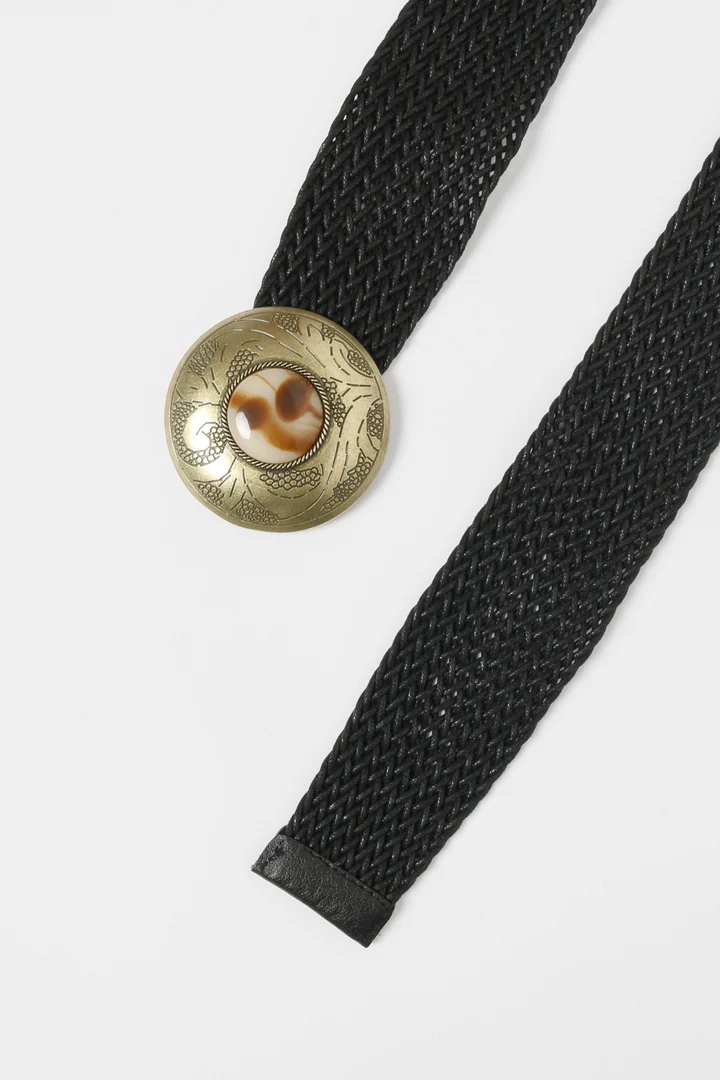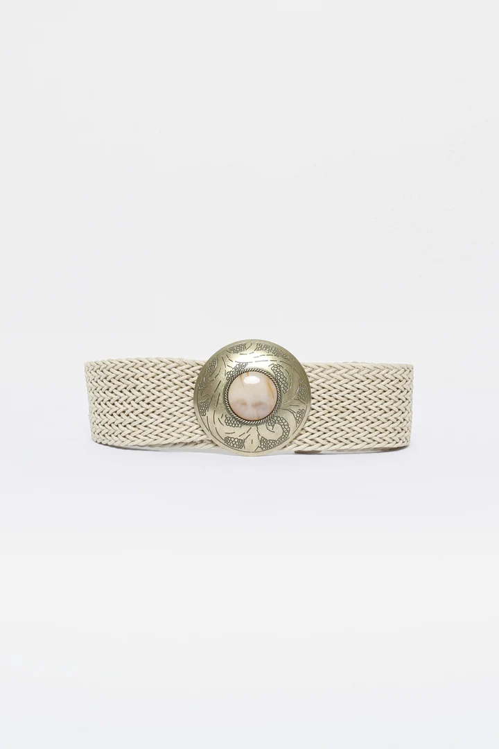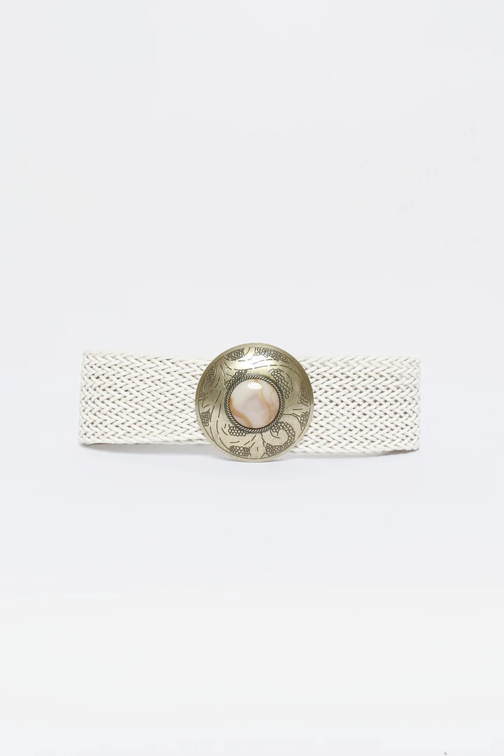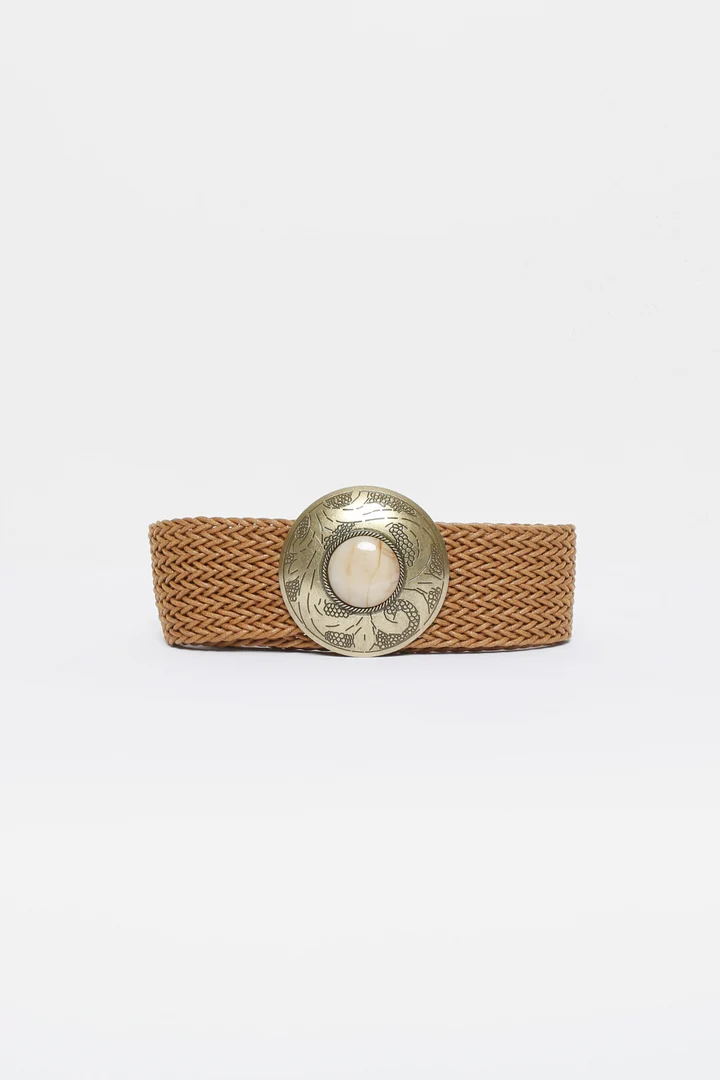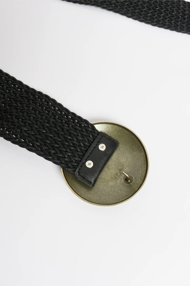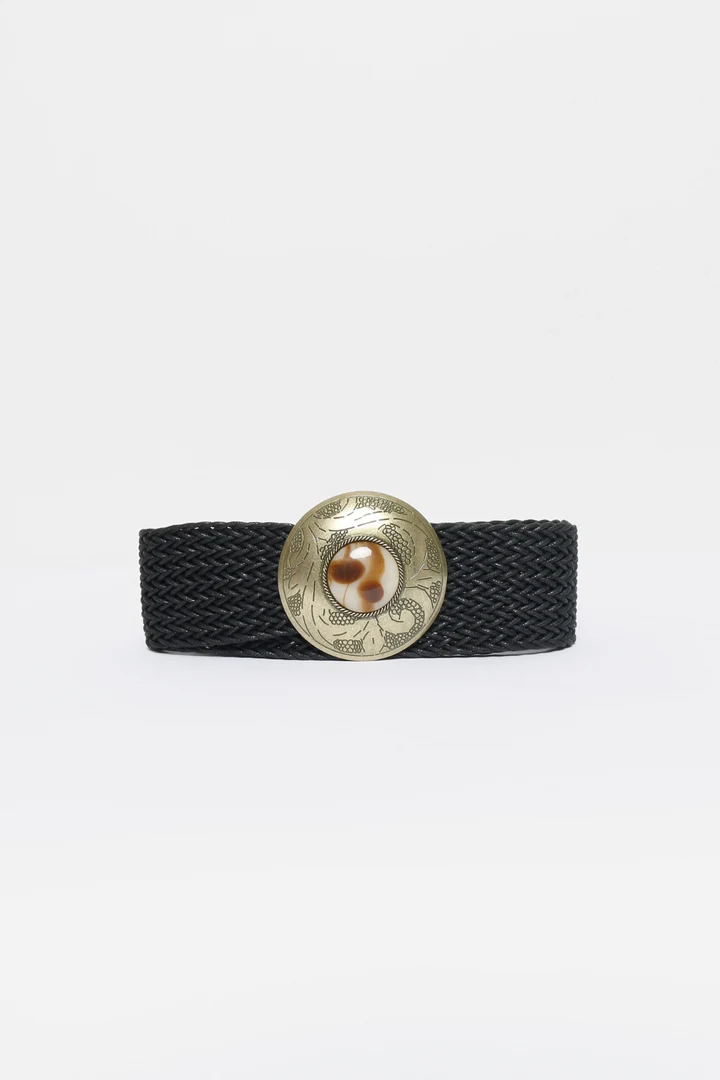 Diseño trenzado. Hebilla redonda grabada. Piedra en hebilla. Cierre de gancho ajustable. Medidas: 110.0 x 5.0 cm.
