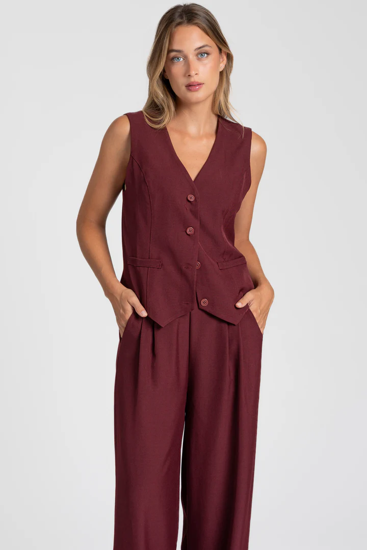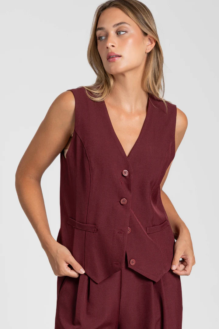 Conjunto de chaleco y pantalón. Chaleco cuello pico. Manga sisa. Cierre botones. Pantalón fluido. Cintura alta. Bolsillos laterales. Disponible en varios colores.